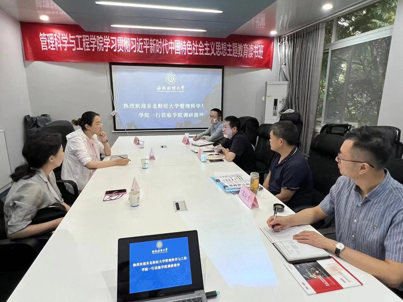 院长鲁万波、副院长肖辉、管理科学与工程系主任苏应生等参加了调研交流会。双方以深入开展学习贯彻习近平新时代中国特色社会主义思想主题教育为契机,认真贯彻落实《关于在全党大兴调查研究的工作方案》,围绕课程思政、学科建设、党建与业务融合发展等问题展开深入研讨交流。