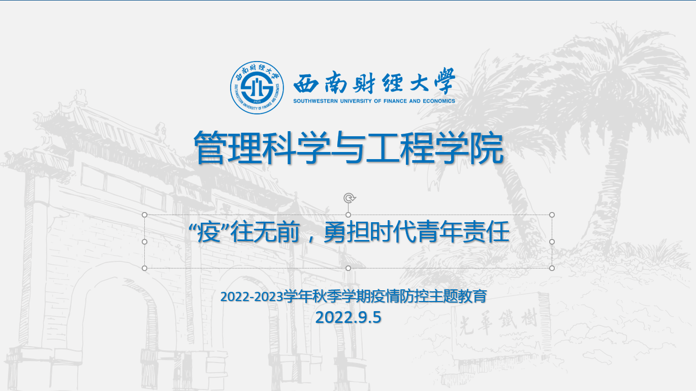 如今,作为一名大学生,我们更应一切行动听指挥,相信“动态清零”是我国当前抗击疫情的最佳选择,加强对各项疫情防控政策的了解。进入校园以来,学校实施了严格的防疫政策,让各项活动得到合理有序的开展。不论是在学生进入校园时对健康码的检查以及核酸检测,还是在教学活动开始后,为防控疫情开展网课教学,开设疫情方面的安全教育,都保障了校园稳定,安全的发展。新生入校时志愿者的周到热情,后勤各方服务的保障,都让学生感受到了家一般的温暖,感受到加入西财这个大家庭的踏实和安心。相信在我们的学校对疫情各方工作果断,精准,高效的领导下,全校师生必然可以众志成城,共克时艰,以实际行动为坚决打赢成都疫情贡献西财力量。