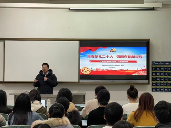硕士、博士党员同学宣讲党的二十大精神。他围绕过去五年的工作和新时代十年的伟大变革,新时代新征程中国共产党的使命任务,实施科教兴国战略、强化现代化建设人才支撑,推动绿色发展、促进人与自然和谐共生等主题进行深入阐述,鼓励同学们从二十大报告中寻找科研方向,并号召广大管科学子将个人理想追求融入党和国家的事业中,努力学好专业本领、勇担青年时代使命,让青春在火热实践中绽放绚丽之花。