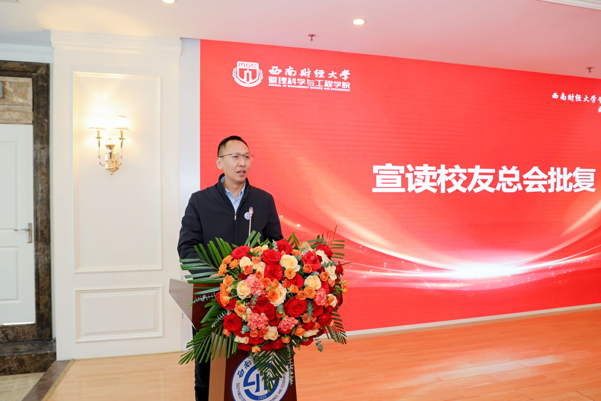 学校校友总会办公室主任张元宣读校友总会批复,向管科德扑在线