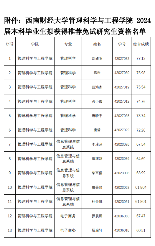 考核、公示、推荐和学校复核,现将2024届本科毕业生拟获得推荐免试攻读研究生资格的同学名单公示于后(见附件)。