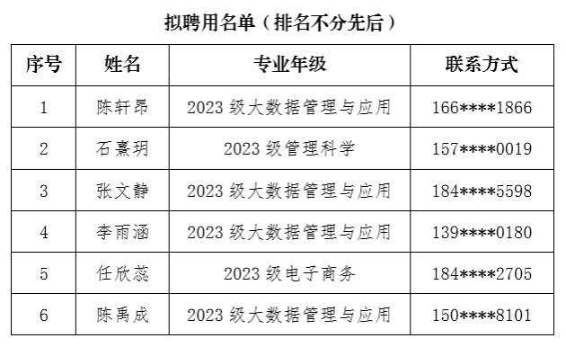经自主报名、资格初审、面试选拔,德扑在线 研究决定以下6名同学为德扑在线 2024级本科新生助理辅导员拟聘用人选,现予以公示,公示期为3个工作日。