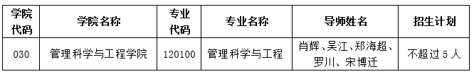管理科学与工程专业;非经济类或管理类专业毕业生接收比例一般不超过总接收人数的20%;考生来源于综合型大学理工类学科的不受比例限制。