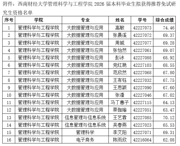 推免工作小组考核、公示及推荐,现将2026届本科毕业生拟获得推荐免试攻读研究生资格的同学名单公示于后(见附件)。