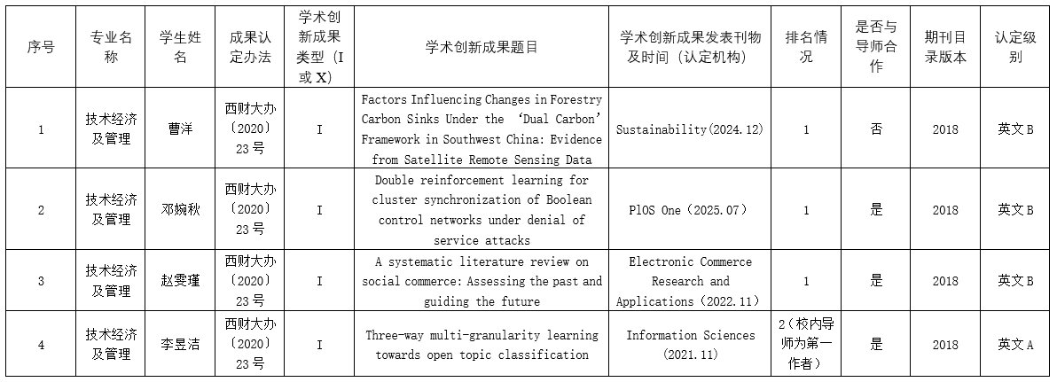 根据《西南财经大学博士生申请学位学术创新成果认定办法》和德州扑克在线练习 相应专业的博士生培养方案要求及科研成果发表的相关规定,德扑在线 对相关博士生的学术创新成果及科研情况进行了审核,现将结果予以公示。公示期自2025年11月4日至11月24日(十五个工作日),在此期间若有异议,请及时反馈德扑在线 。